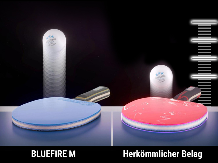 Topspin-Spieler aus der Halbdistanz schätzen den BLUEFIRE M: Der erhöhte Katapulteffekt ermöglicht auch aus tischferneren Positionen unter Druck ein sicheres und ruhiges Spiel.